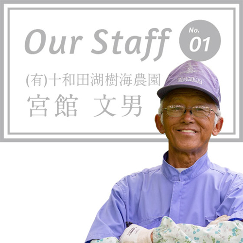 Our Staff 01 (有)十和田樹海農園 宮館 文男 小坂町のぶどう栽培は、昭和63年(1988)利用していない農地活用のため、鴇(ときと)地区で始まりました。